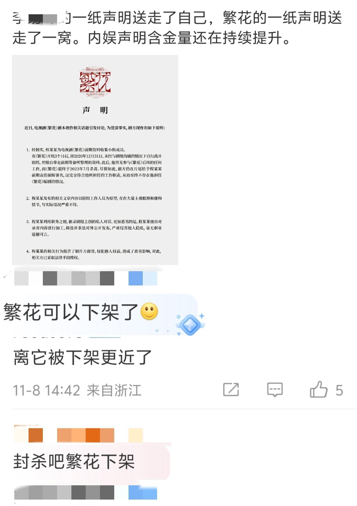 有网友说《繁花》要被禁止播出,且所有参演的演员以后都不能提起这部剧和所演角色。