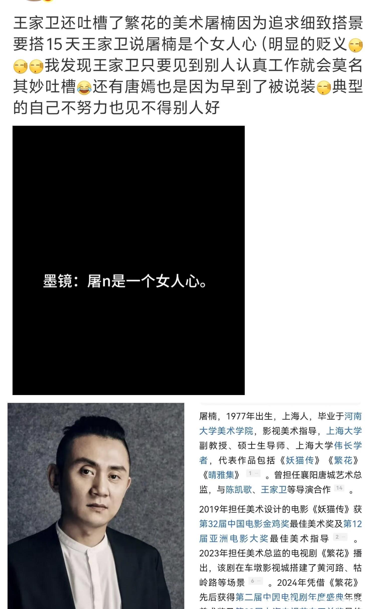 还吐槽《繁花》美术指导屠楠要求太多太严格,搭景就需要15天,嘲讽他有一颗女人心。可是屠楠《繁花》也是最佳美术奖,属于剧组共同的荣誉,增添了剧的含金量。